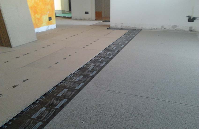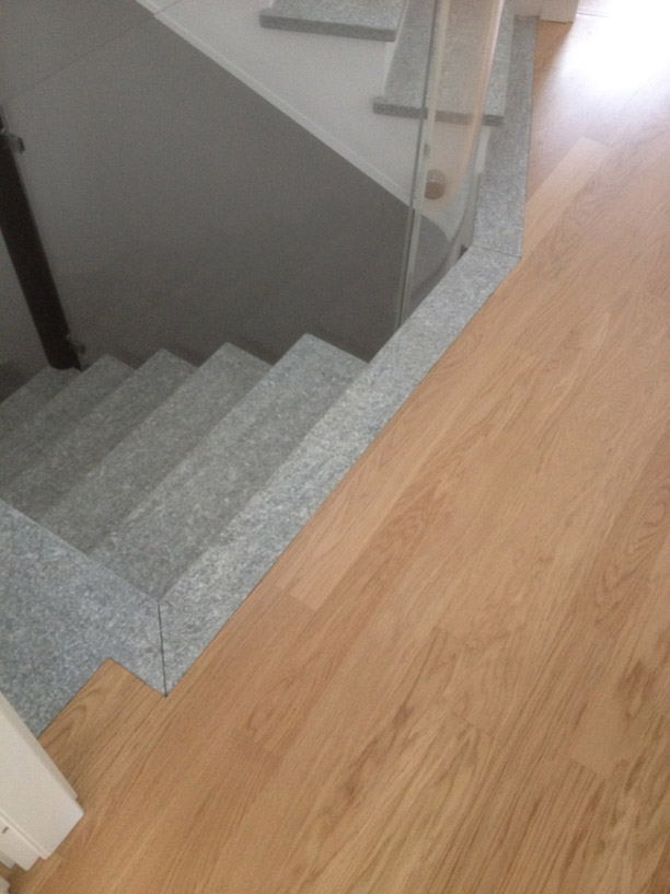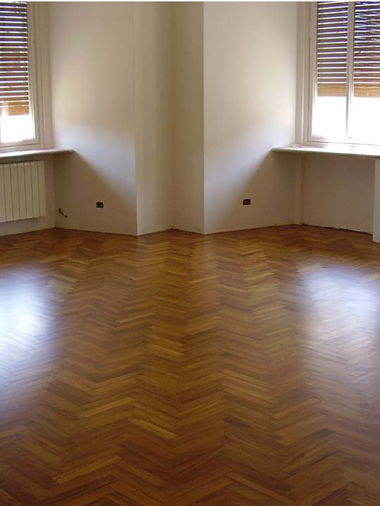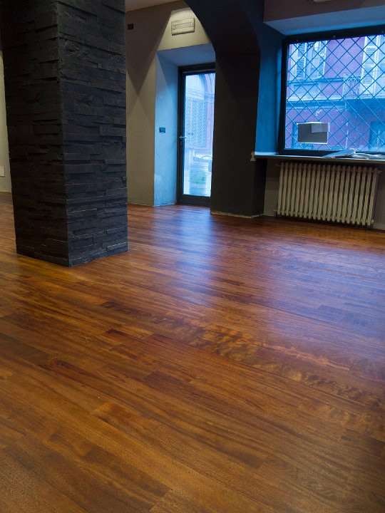 Parquet in Iroko a spina da muro a muro incollato su pavimento in graniglia.