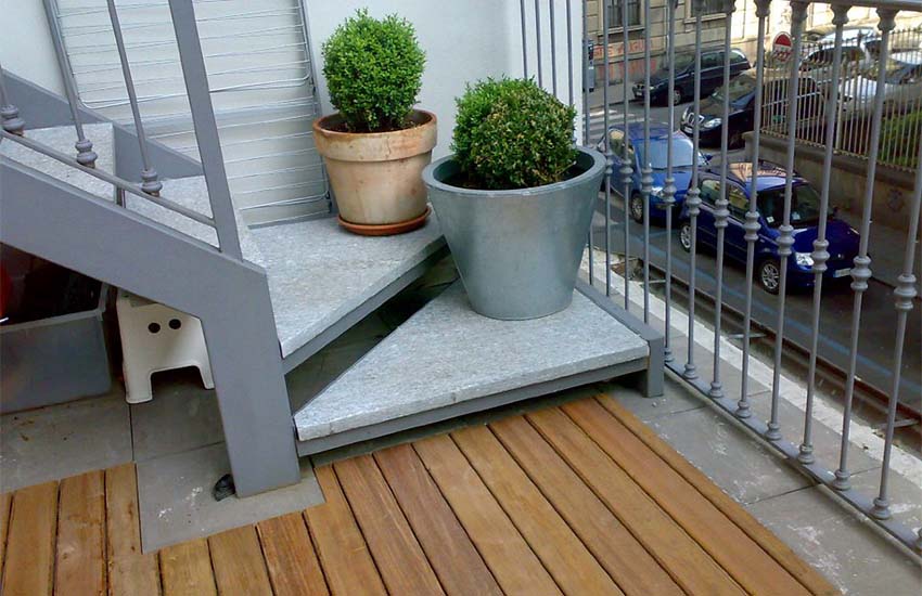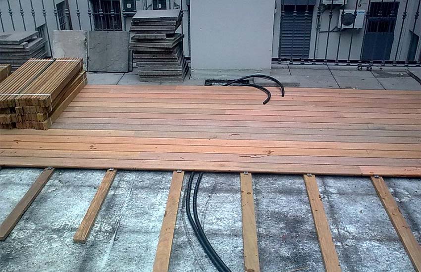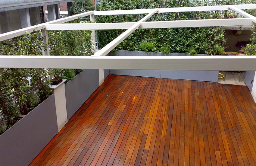 Terrazzo realizzato in legno di Ipe’ su travetti, finitura trattamento ad olio.