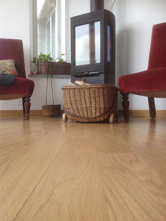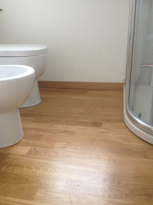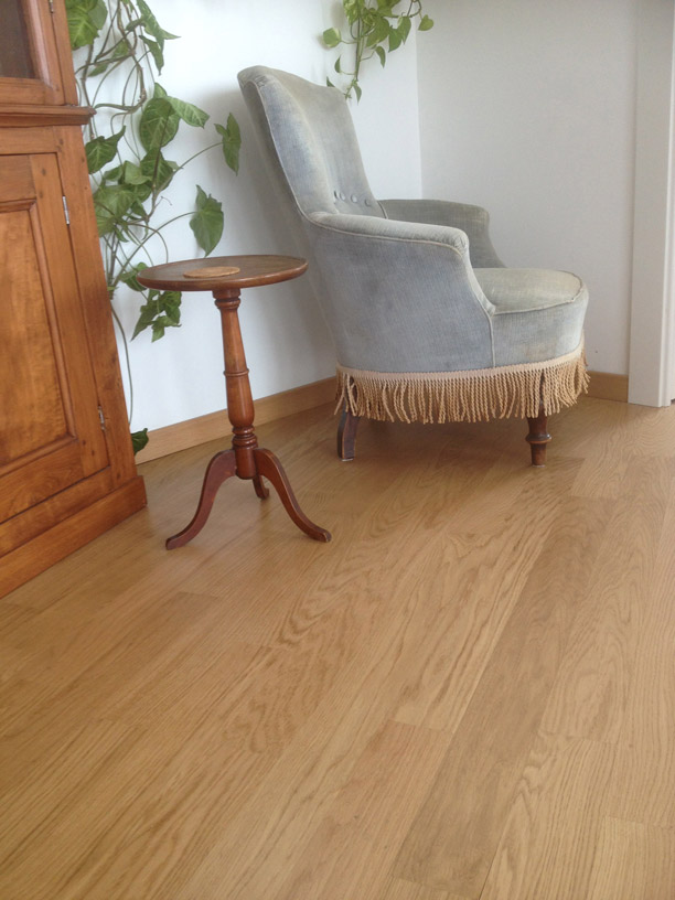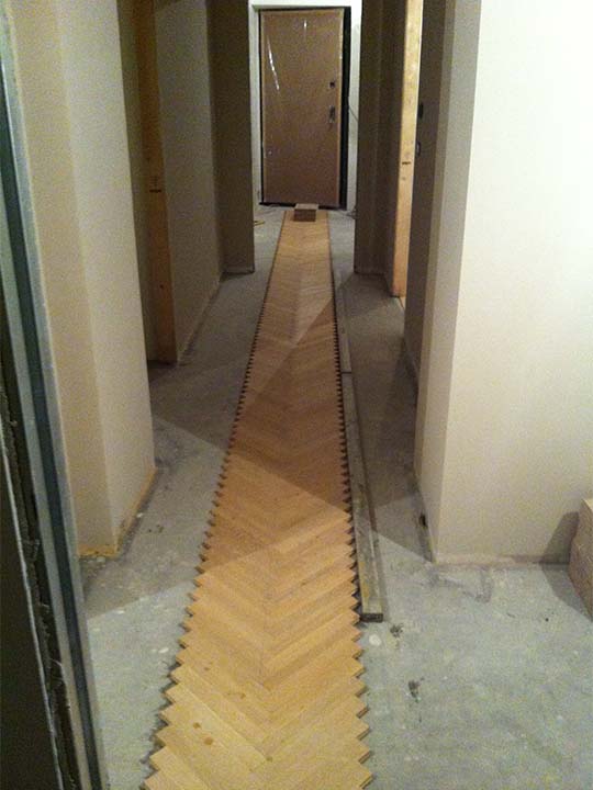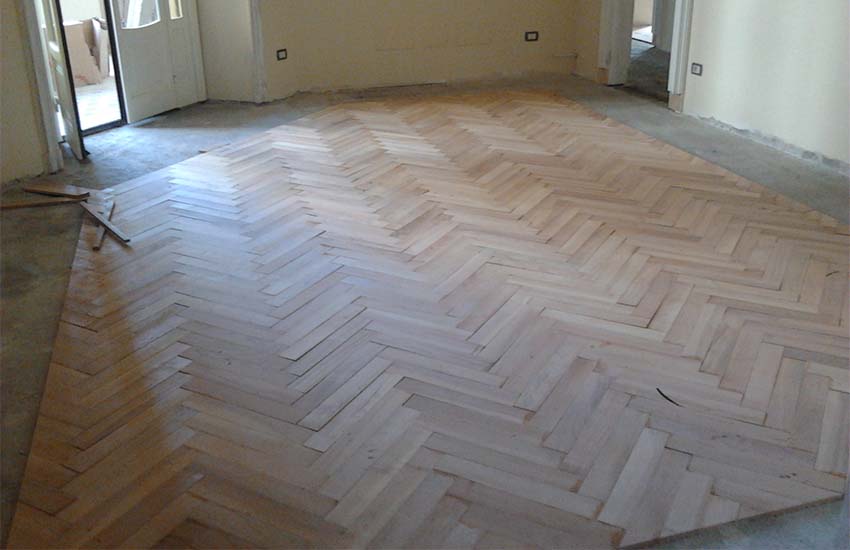 Parvimento in legno di Rovere realizzato a spina di pesce da muro a muro.