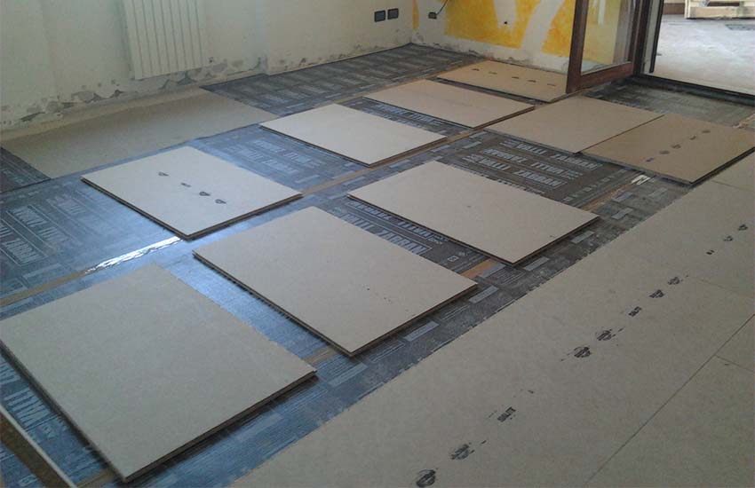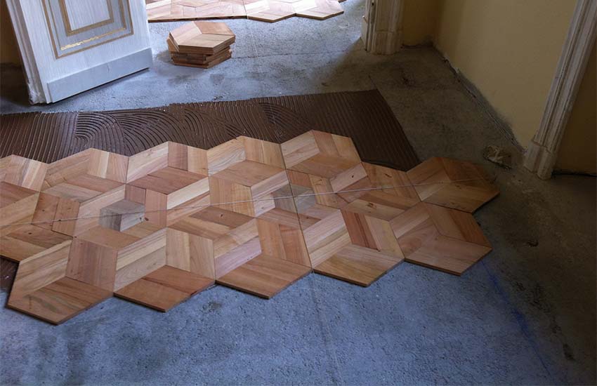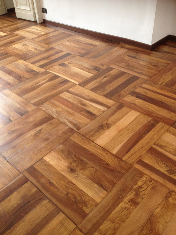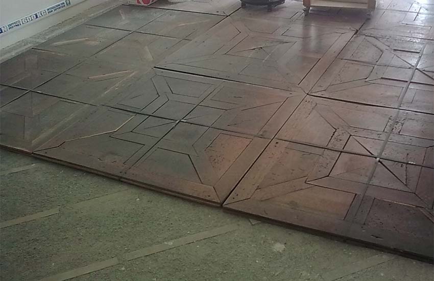 Rifacimento pavimento in quadrotte di iroko, posate incollate su pannelli inchiodati su travetti.