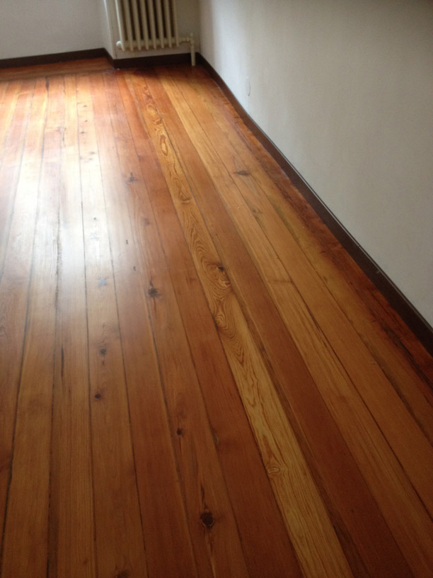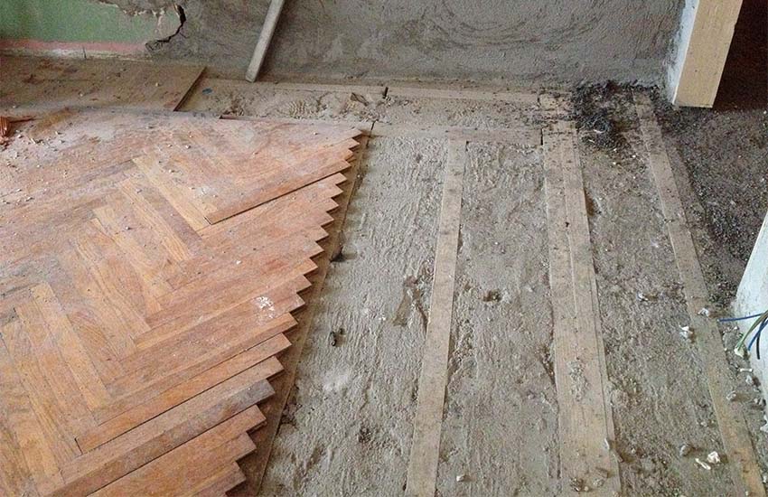 Smontaggio del vecchio parquet inchiodato su malasine e rifacimento con Larice nuovo trattato a cera.
